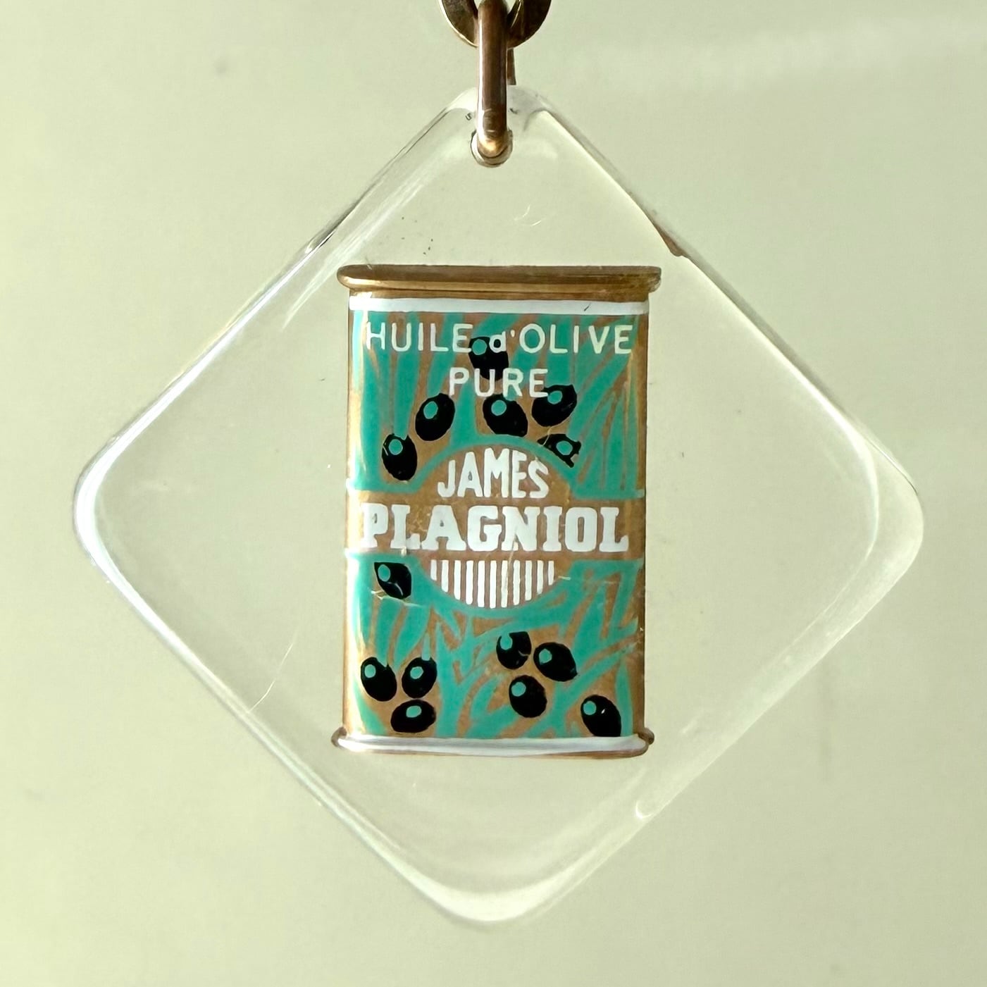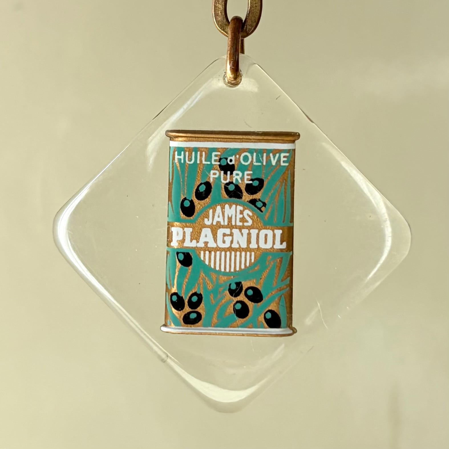 オリーブオイルの缶が閉じ込められたデザイン。